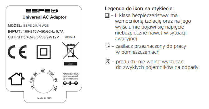 ZASILACZ WTYCZKOWY 3-12V 2A 1m. 3V 4,5V 5V 6V 7,5V 9V 12VDC REGULOWANY ESPE