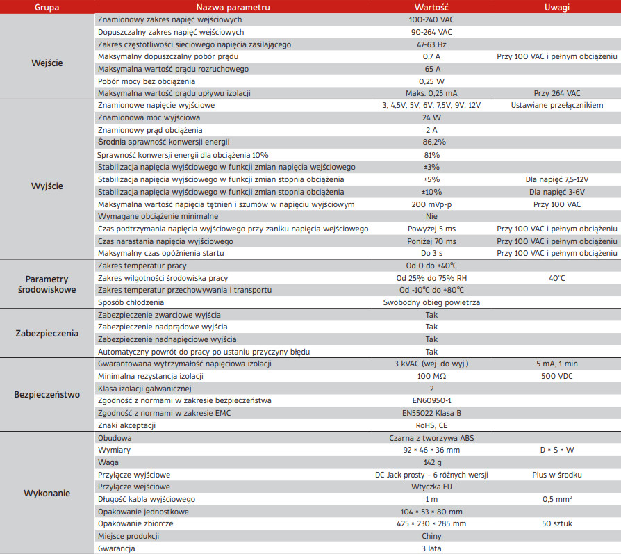 Niewielki i wydajny 24-watowy zasilacz wtyczkowy o uniwersalnym przeznaczeniu. Dostarcza 7 stabilizowanych napięć wyjściowych o wartości ustawianej obrotowym przełącznikiem (od 3 do 12 V). Jego konstrukcja bazuje na wysokiej jakości podzespołach elektronicznych pozwalających na ciągłą, długotrwałą pracę w każdych warunkach. Jest niezawodny i w pełni zabezpieczony przed przeciążeniem. Ma uniwersalne zastosowanie i znakomite parametry techniczne.